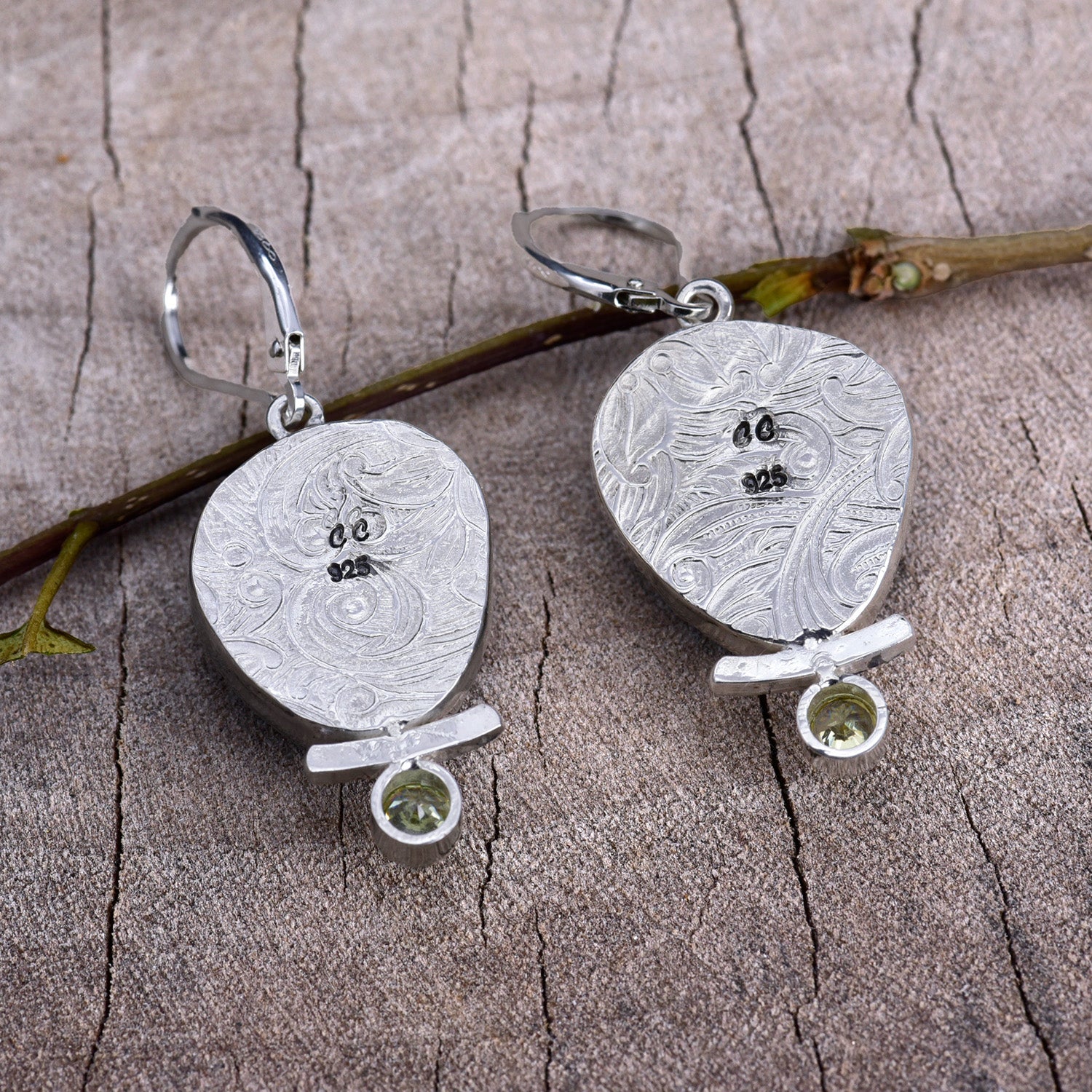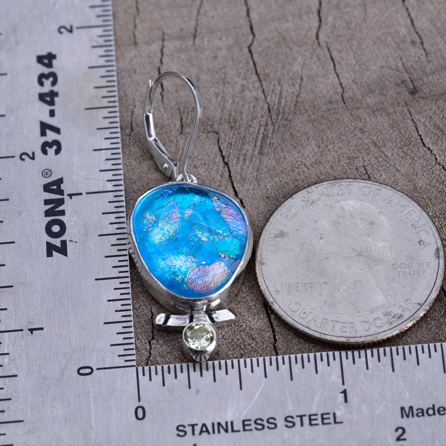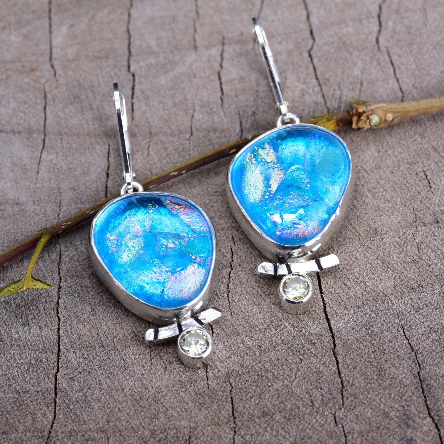 Fused dichroic glass cabochons in shades of shimmering blue iare captured in handmade settings of tarnish resistant Argentium ® sterling silver and accented with sparkly cubic zirconias. The embossed back of the earrings bear my maker's mark "CC" and the 925 sterling silver hallmark. Includes sterling leverback ear wires.