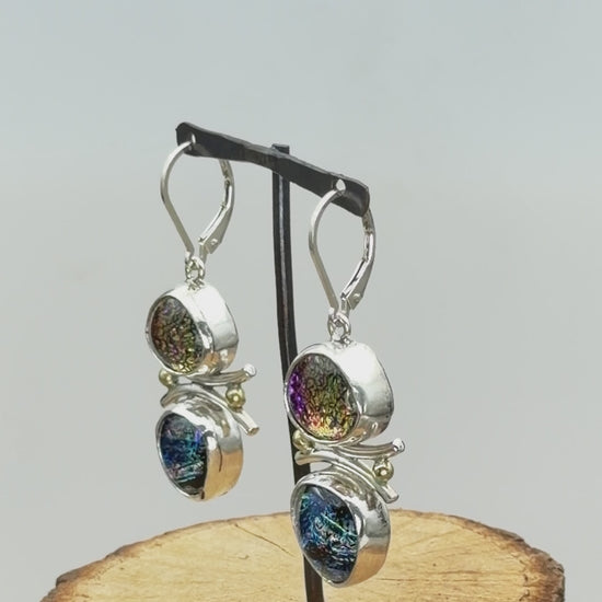 Artistic fused dichroic glass earrings in hand crafted settings of sterling silver accented with gold (E937)