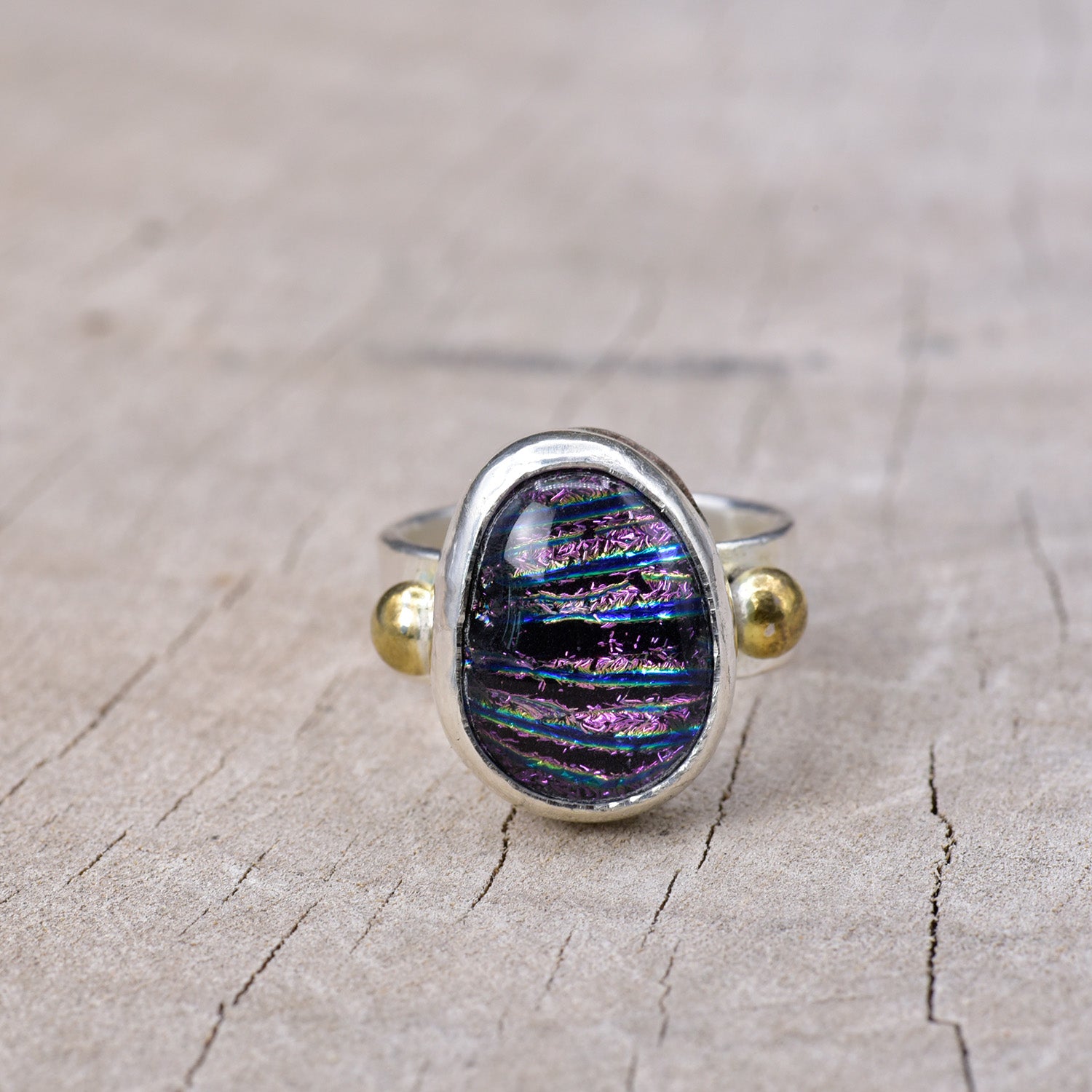 Fused dichroic glass ring in a handcrafted setting of sterling silver (R941)