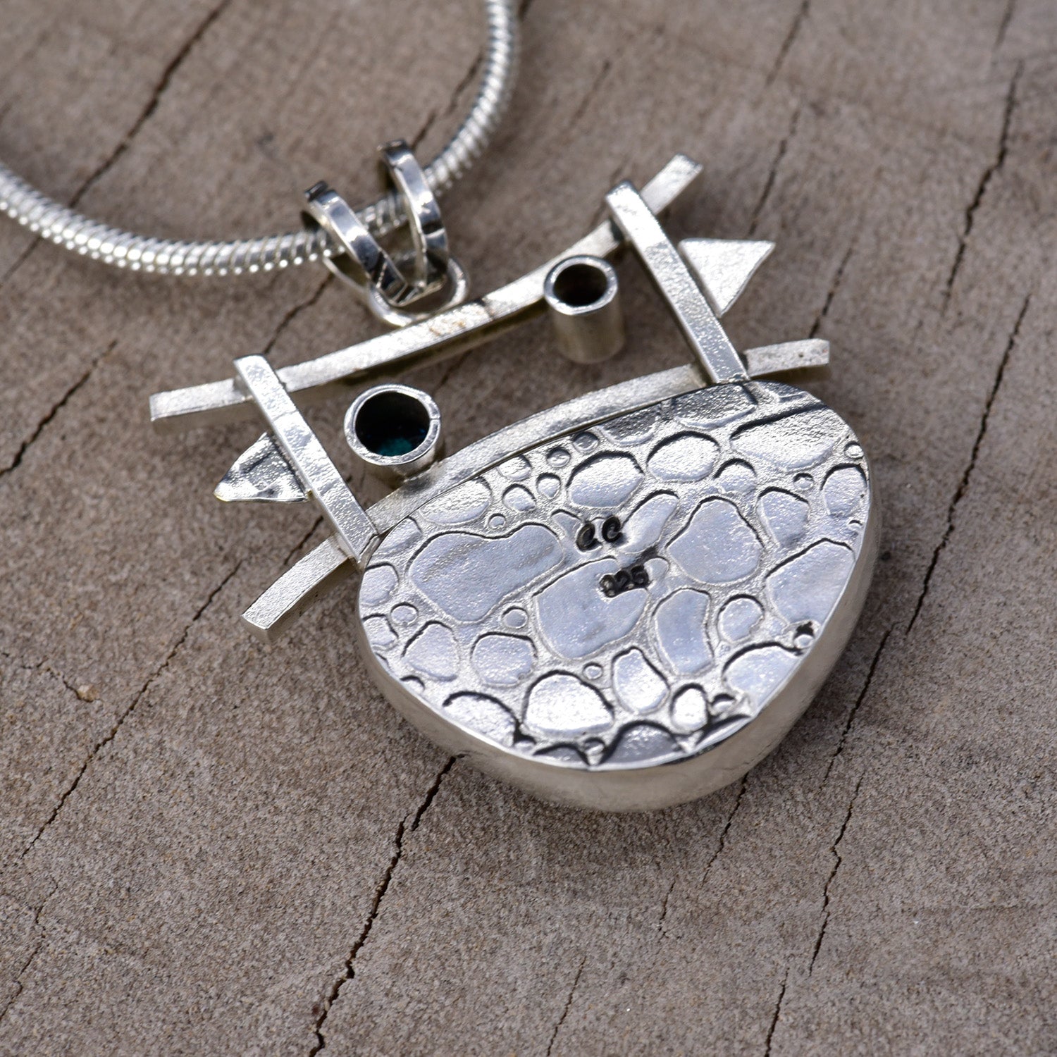 A flashy hot pink/blue dichroic glass cabochon is captured in a hand stamped and oxidized setting of tarnish resistant Argentium ® sterling silver accented with sparkly cubic zirconias and 14K gold plating. The embossed back of the necklace bears my maker's mark "CC" and the 925 sterling silver hallmark. Includes silver plated snake chain.