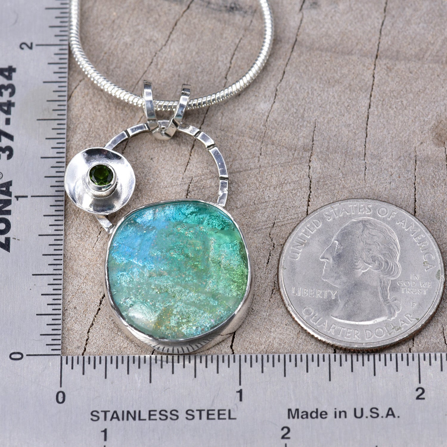 A shimmering turquoise dichroic glass cabochon is captured in a hand stamped and oxidized setting of tarnish resistant Argentium ® sterling silver accented with a sparkly cubic zirconia. The embossed back of the necklace bears my maker's mark "CC" and the 925 sterling silver hallmark. Includes silver plated snake chain.