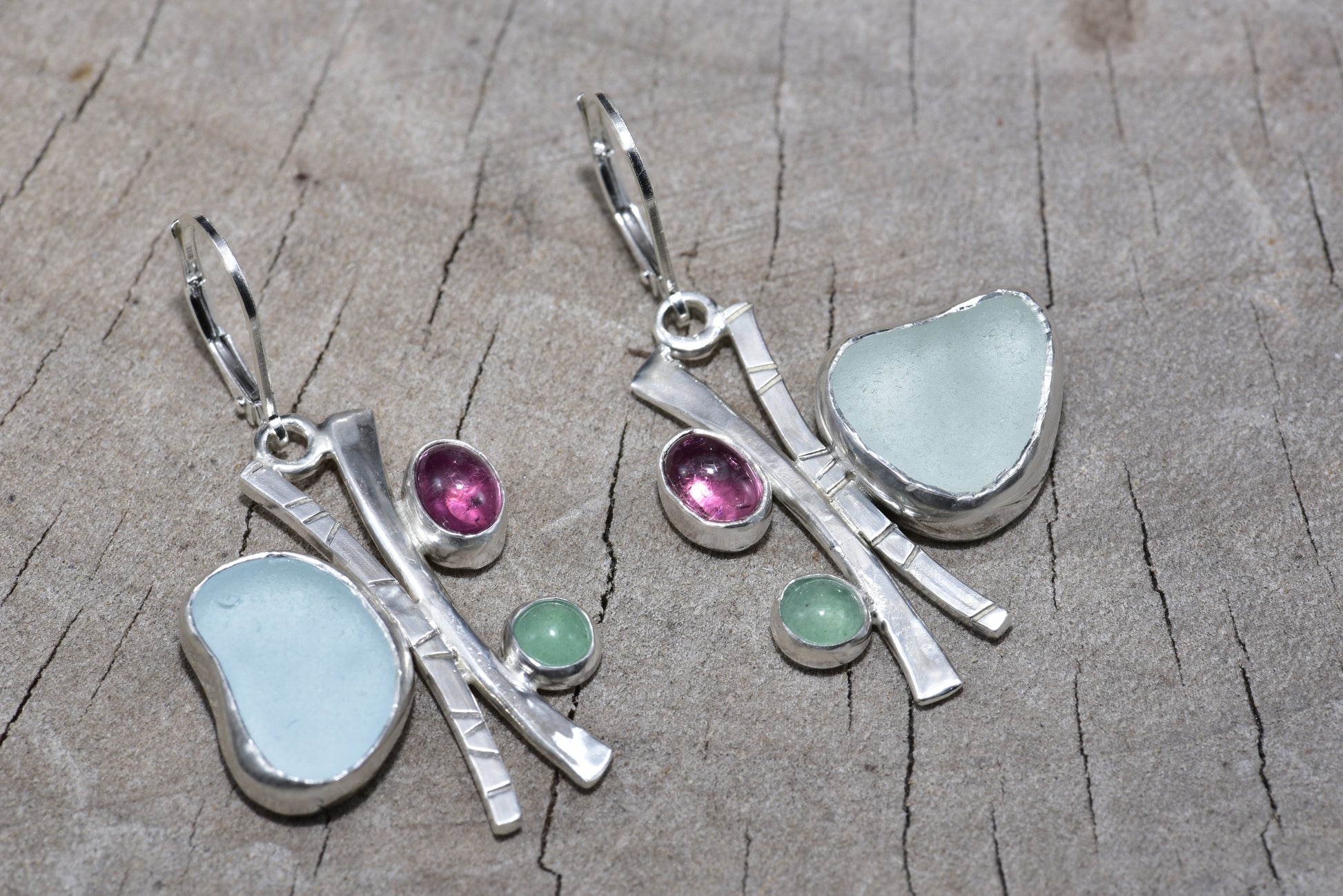 Sea glass earrings in sterling silverSea glass and gemstone earrings in hand crafted settings of sterling silver. (E839)